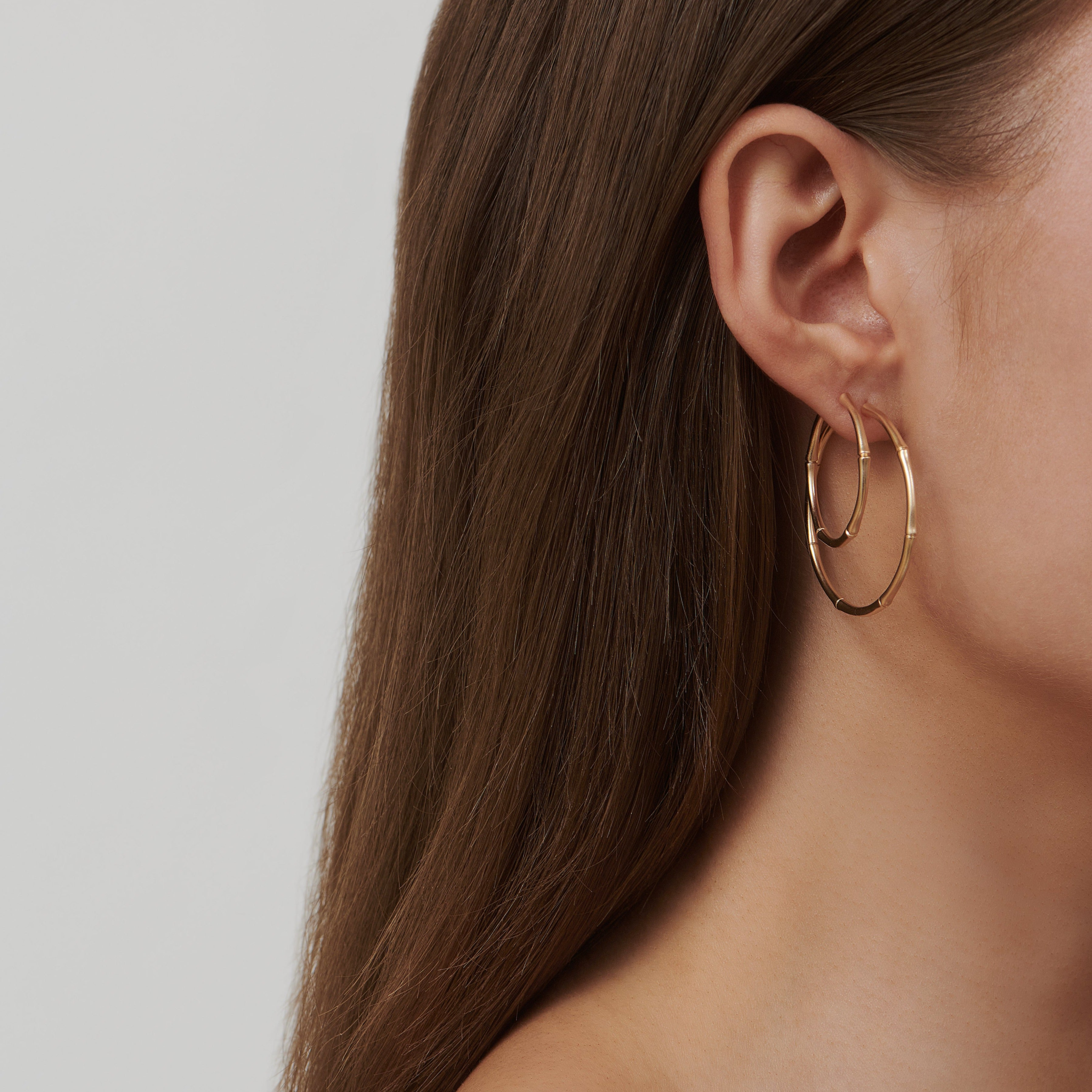 Disse store hoops i 14 karat guld er skabt med et ønske om at hylde naturens skønhed. Designet drager inspiration fra bambus, og indfanger hermed den perfekte balance mellem feminint og råt. Denne style kan bæres alene eller kombineret med de resterende hoops fra vores Bamboo kollektion for et unikt udtryk. Øreringen måler 37.6 x 2.2 mm.