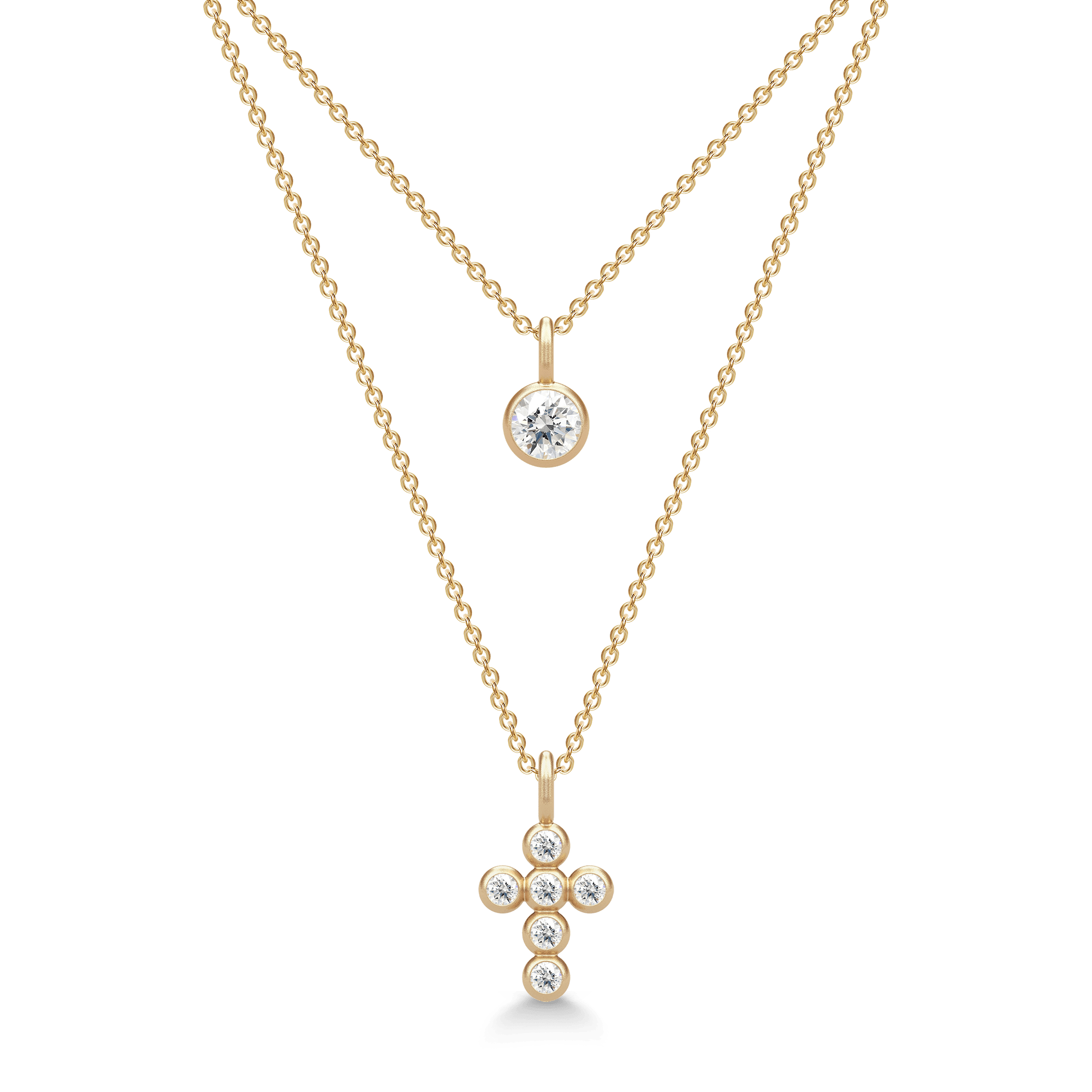 Vores Diamond Cross Pendant tilføjer et strejf af glans og ynde til enhver halskæde. Vedhænget er produceret i 100% recycled 14 karat guld og er prydet med seks Wesselton diamanter med i alt 0,15 carat. Vedhænget kan styles med vores Purity og Classic halskæde. Gå på opdagelse i vores Eden kollektion for at finde vores udvalg af elegante vedhæng, som kan kombineres med vores Diamond Cross Pendant for en mere personligt udtryk.
