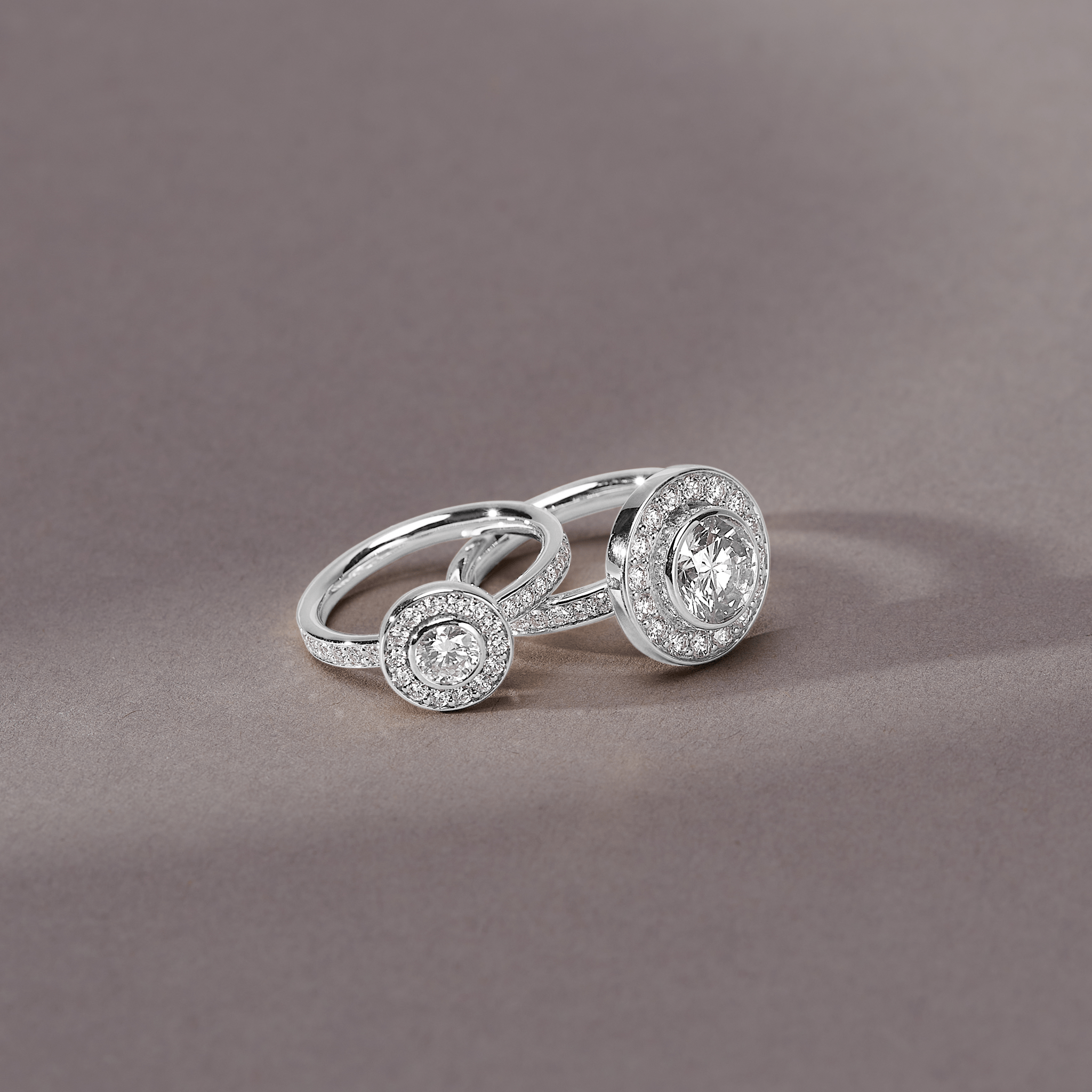 18kt hvidguld fremstillet af genanvendte metaller med brillantslebne I/SI og F-G/VS diamanter. Center diamant I/SI 2.0 ct. omgivet af F-G/VS diamanter 16x 0,3 ct. og 31x 0,015ct. – alle etisk fremskaffede og håndsatte for varig glans.