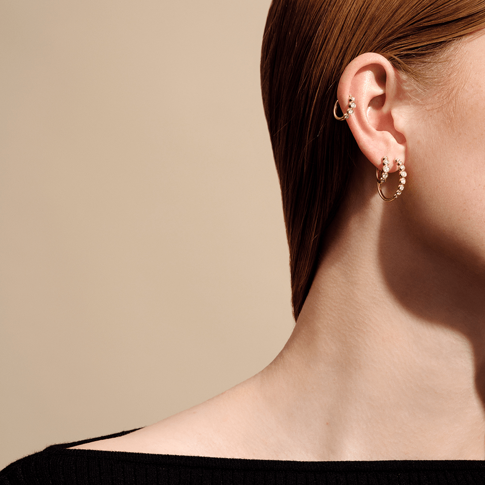 Disse Lumen Medium Hoops præsenterer et sofistikeret design af Julie Sandlau, hvor klassiske og tidløse detaljer kombineres. Disse hoops er omhyggeligt fattet med Top Wesselton diamanter sat i 100% genanvendt 18 karat guld, med den ikoniske Julie Sandlau poleret finish. Med en samlet caratvægt på 0.48 udstråler disse øreringe en diskret, men enestående elegance. For et mere detaljeret udtryk, kan disse øreringe styles med vores Lumi Midi hoops fra samme kollektion.