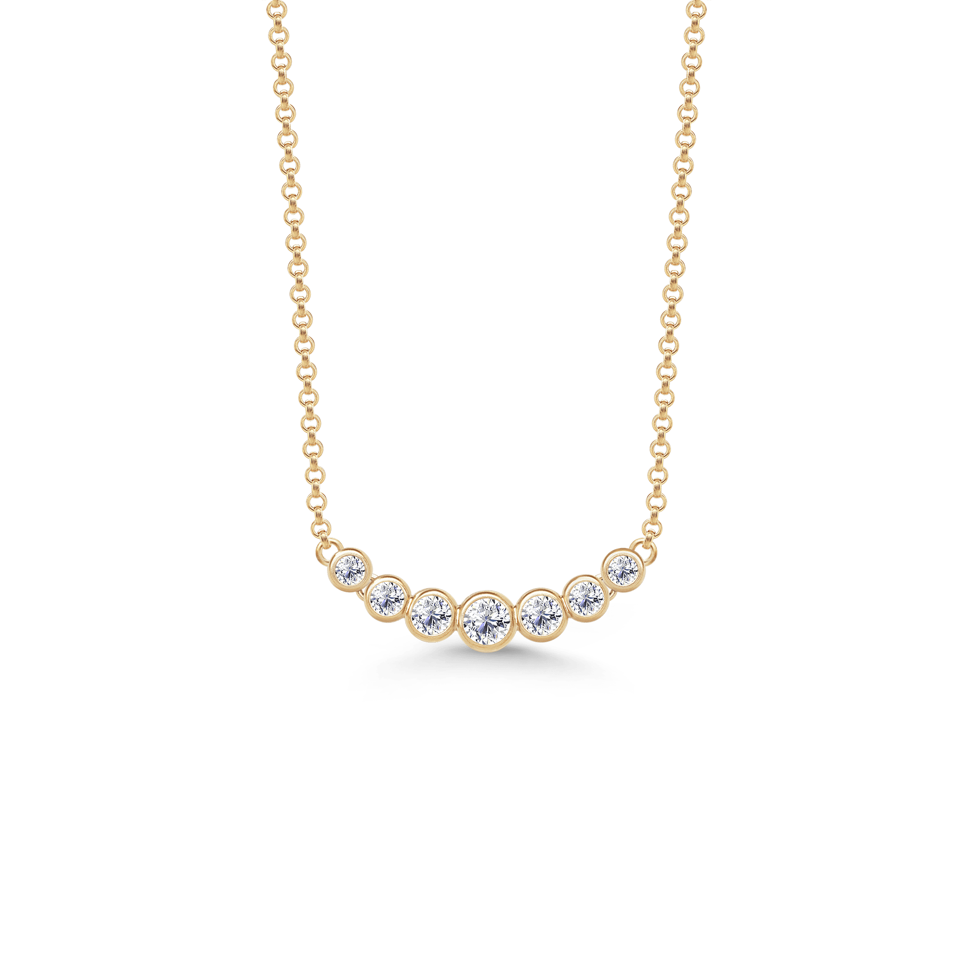 Denne Lumen halskæde præsenterer en stilren 42 cm kæde, usmykket med et ekstravagant vedhæng, hvor størrelsesgraduerede Top Wesselton diamanter danner en organisk og elegant silhuet. Denne halskæde er fattet med 0.3 carat diamanter sat i 100% genanvendt 18 karat guld, med den ikoniske Julie Sandlau satin finish. Vores Lumen halskæde repræsenterer sublimt håndværk og supplerer harmonisk de unikke designs fra Lumi kollektionen, hvilket gør denne kæde perfekt til styling.