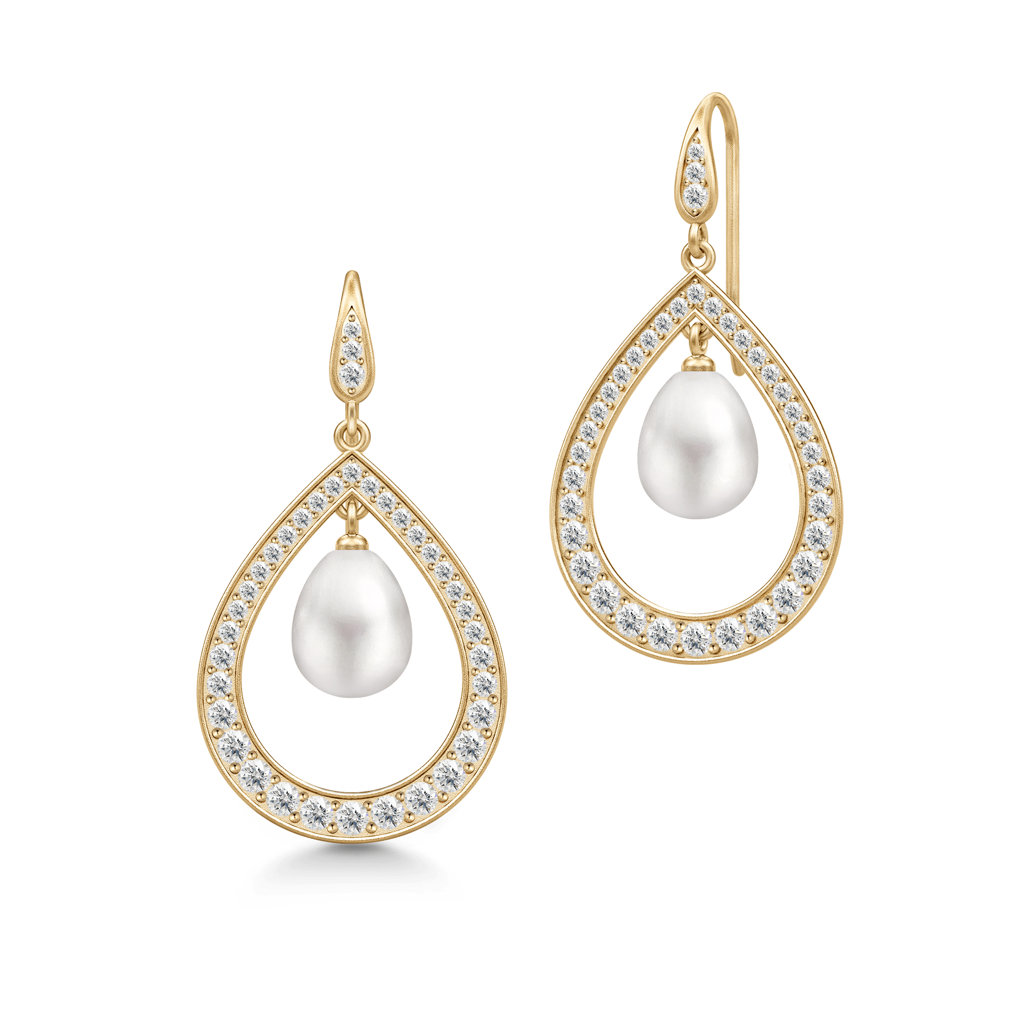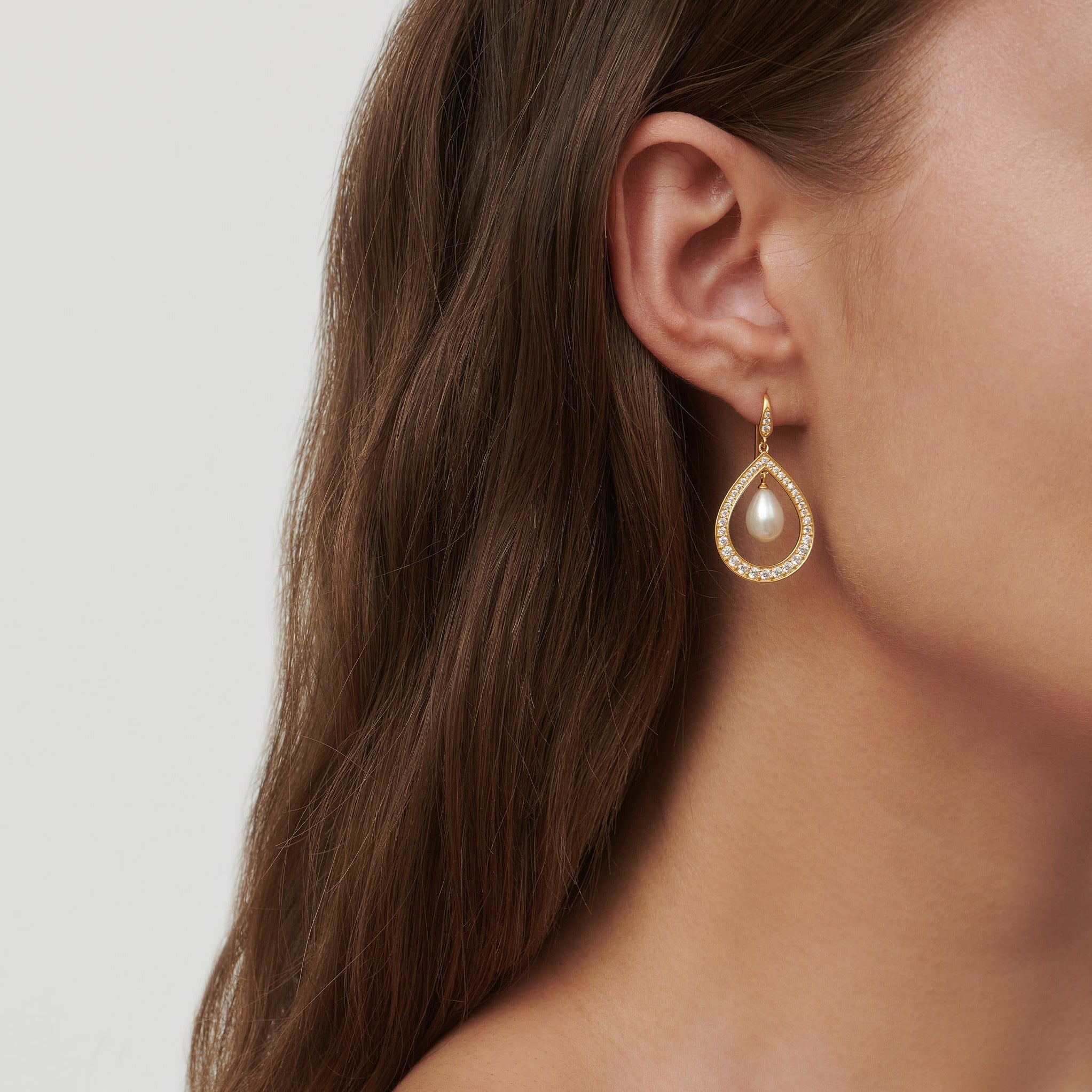 Smuk og feminine øreringe produceret i 22 karat forgyldt 925 sterlingsølv med ferskvandsperler og klare kubiske zirkoner. Måler 34,3 x 18,6 mm