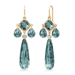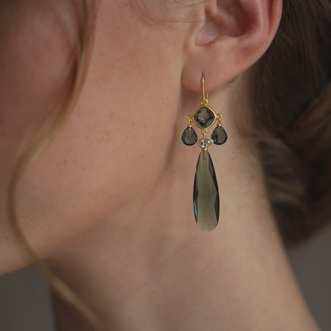 Hver Ofelia Chandelier ørering er prydet med en cushion-slebet ædelsten, to små rosenslebne dråber, en markant rosenslebet briolet og en hvid oval zirkonia — alle etisk fremskaffede og håndisatte for varig glans.
