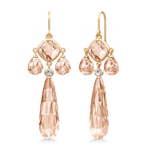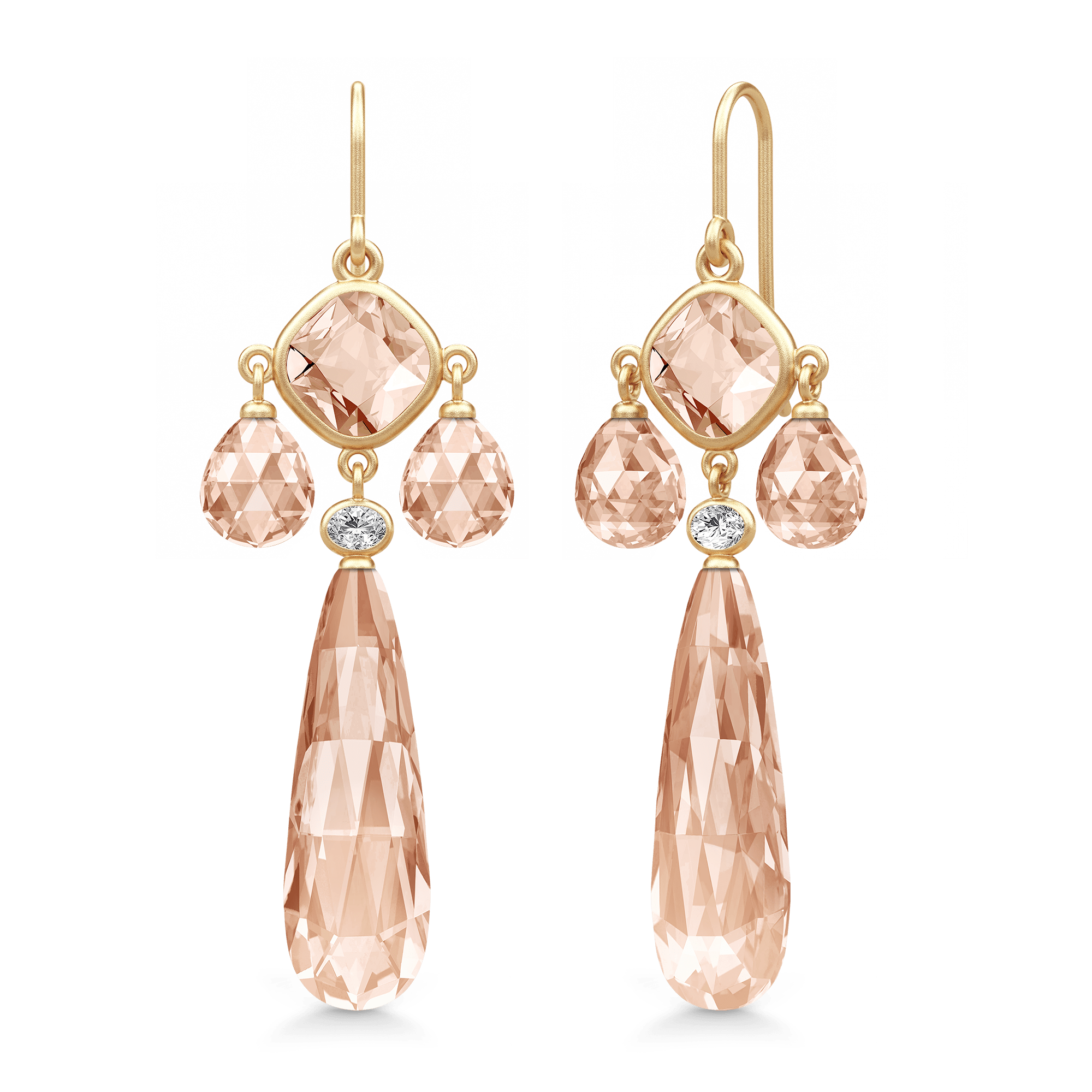 Hver Ofelia Chandelier ørering er prydet med en cushion-slebet ædelsten, to små rosenslebne dråber, en markant rosenslebet briolet og en hvid oval zirkonia — alle etisk fremskaffede og håndisatte for varig glans.