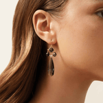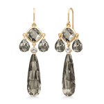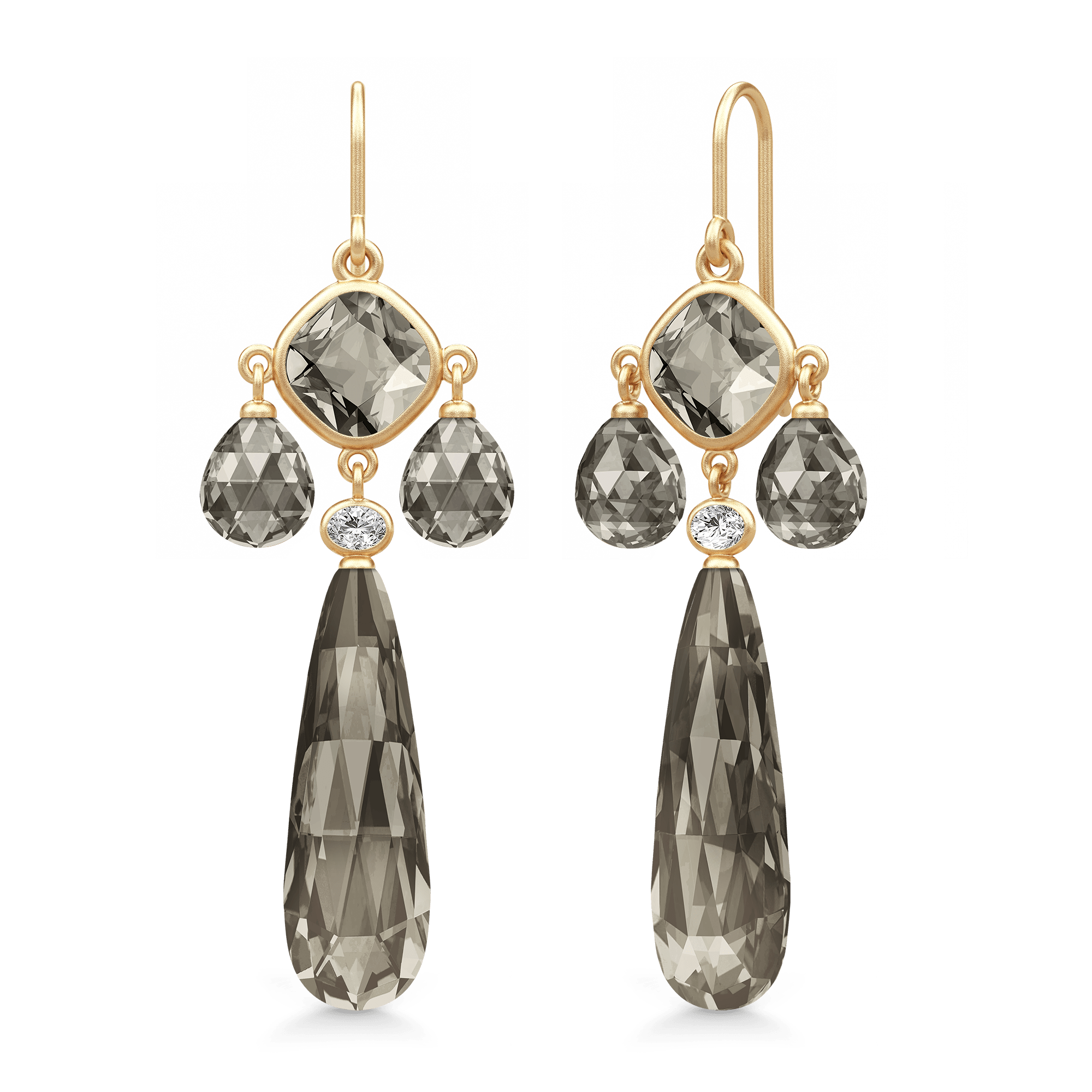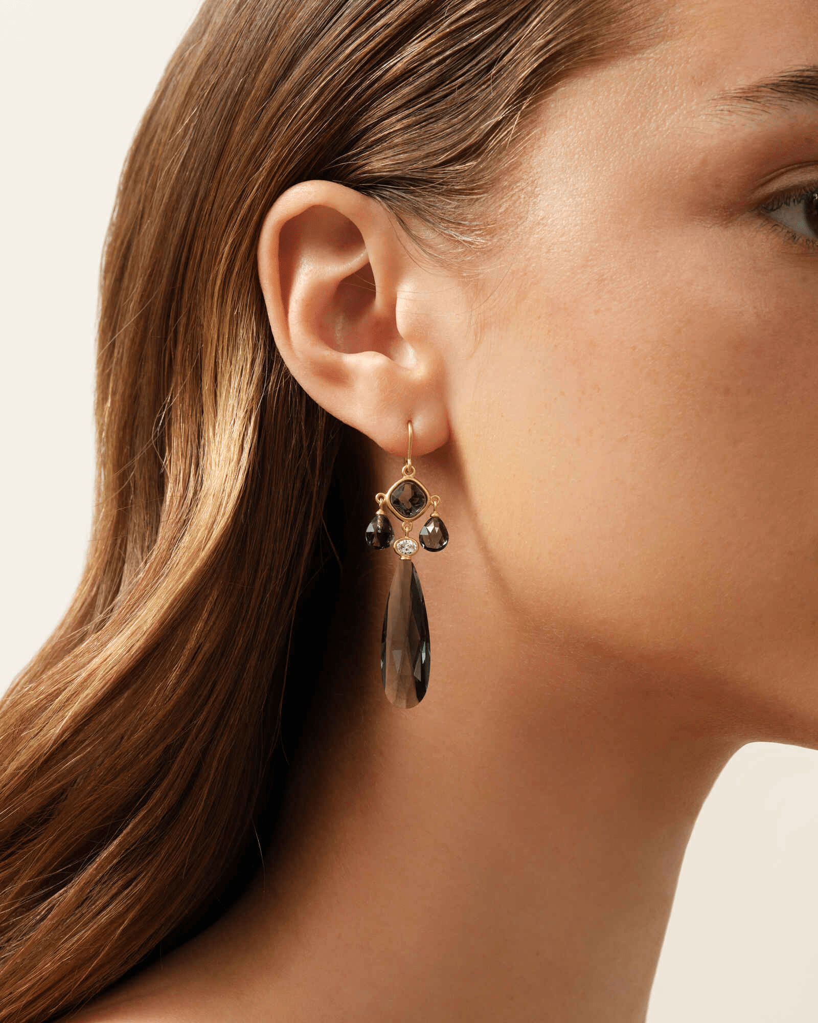 Hver Ofelia Chandelier ørering er prydet med en cushion-slebet ædelsten, to små rosenslebne dråber, en markant rosenslebet briolet og en hvid oval zirkonia — alle etisk fremskaffede og håndisatte for varig glans.