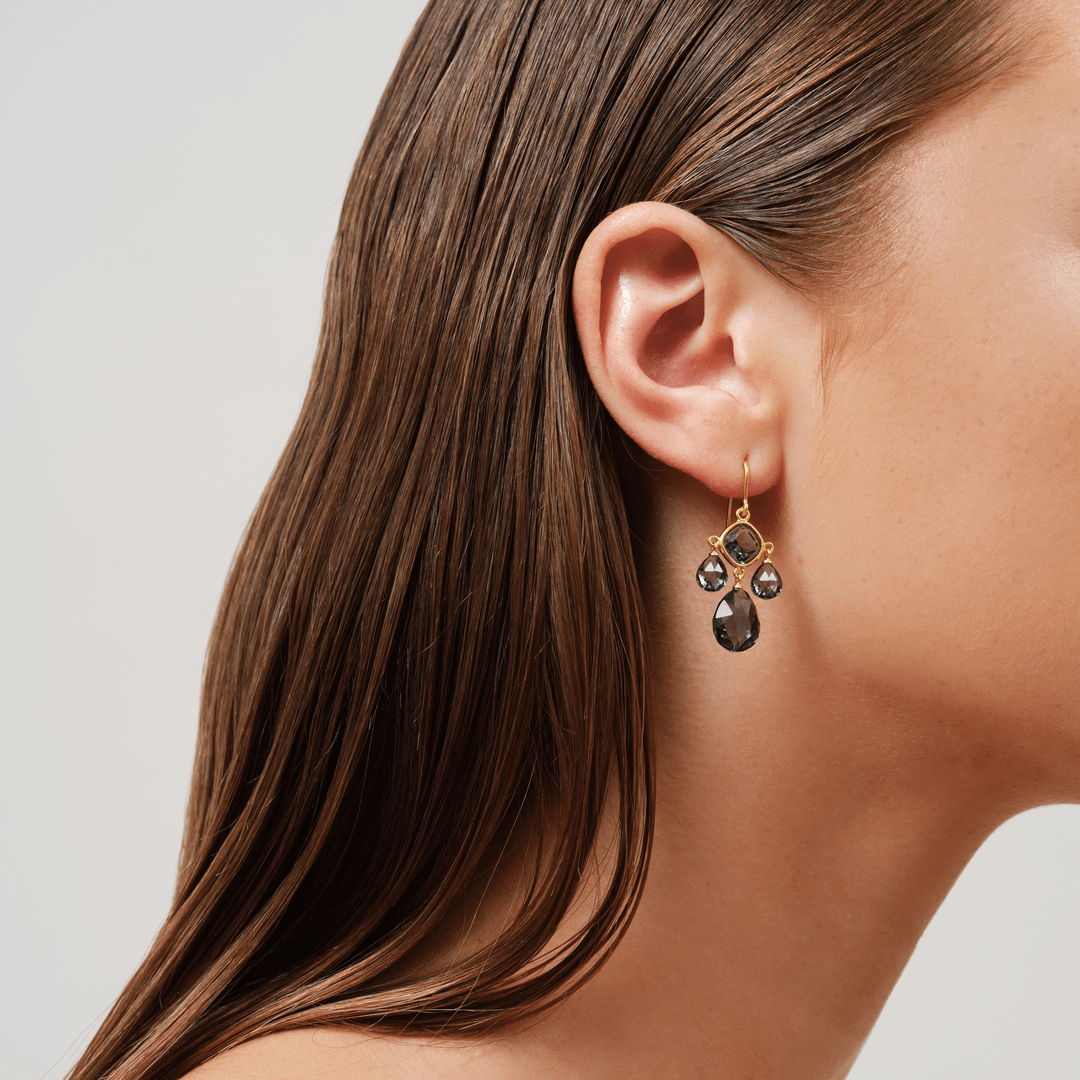 Hver ørering er smykket med en cushion-cut ædelsten og tre dråbeformede briolettes med rose-cut, alle ansvarligt udvundet og håndsat for varig glans.