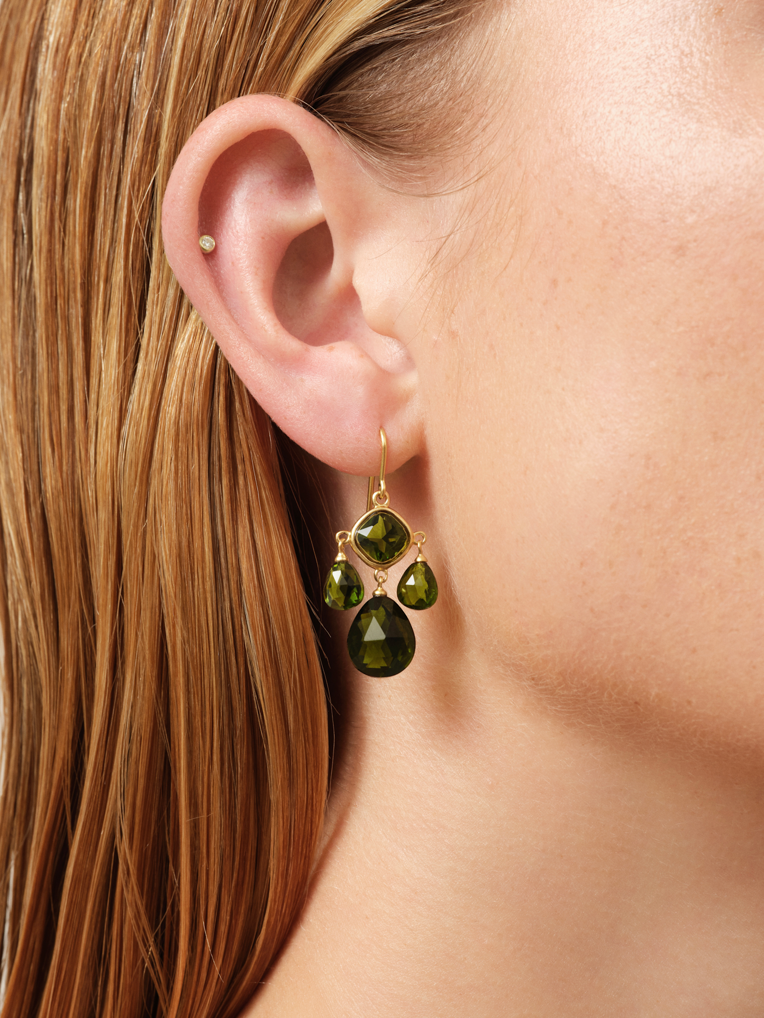 Hver ørering er smykket med en cushion-cut ædelsten og tre dråbeformede briolettes med rose-cut, alle ansvarligt udvundet og håndsat for varig glans.