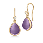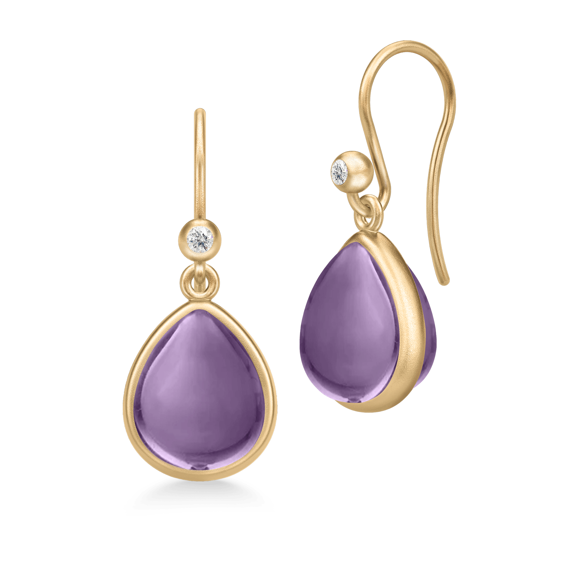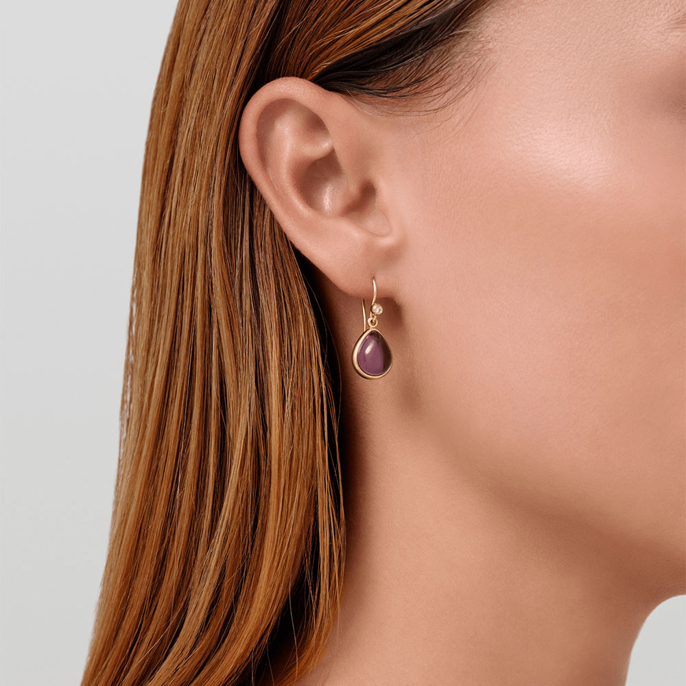 Paloma øreringe er dekoreret med pear cabonchon krystaller indrammet af et guldbånd, der repræsenterer en af Julie Sandlaus signaturer. Øreringene er håndlavet i 22 karat forgyldt 925 sterling sølv. På krogen er en funklede cubiske zirkonia, der giver øreringene ektra elegance.