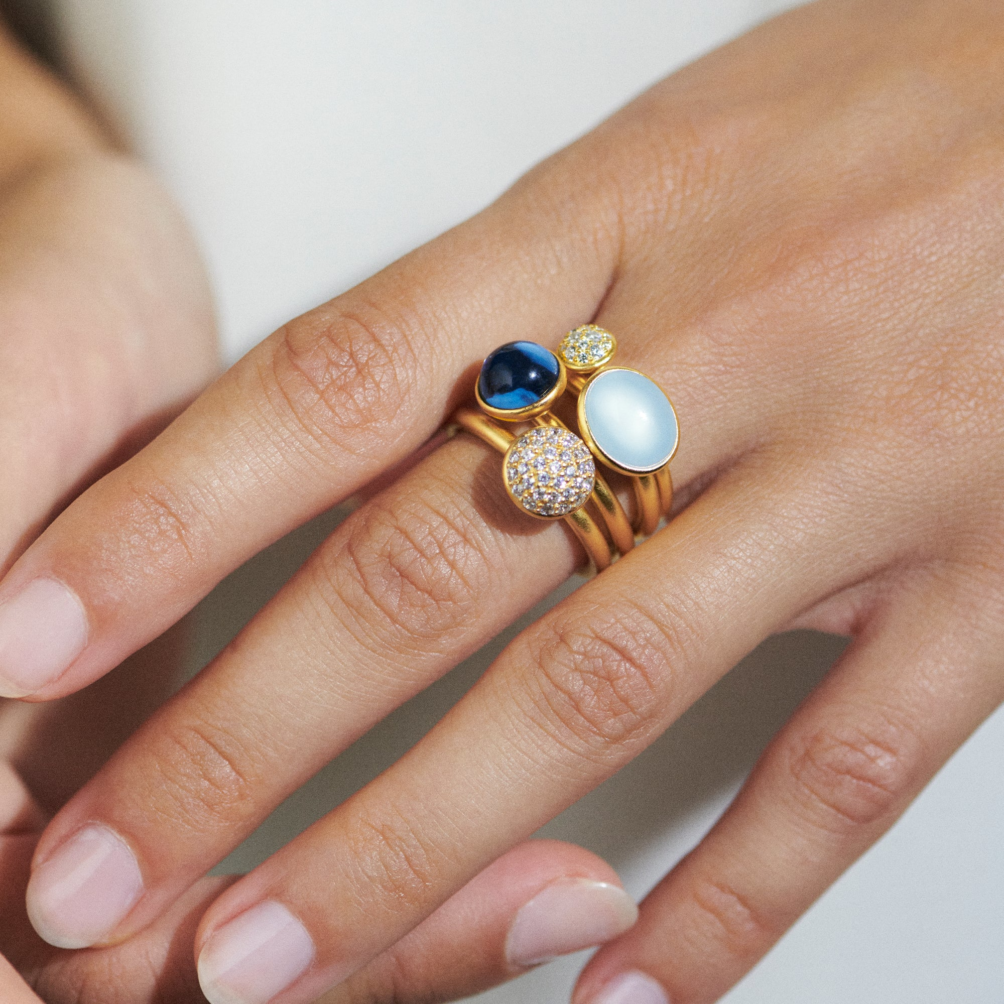 Dette elegante design er en del af vores Prime-kollektion og fremhæver en smuk farverig krystal, omgivet af et guldbånd. Den cabochon-slebne krystal har en diameter på 8 mm og fås i flere farver. Ringen er fremstillet 22 karat forgyldt 925 sterling sølv. For et sofistikeret og personaliseret udtryk, kan ringen kombineres med flere af Julie Sandlaus andre ringe. Gå på opdagelse i Prime kollektionen og find matchende øreringe, armbånd eller vedhæng.