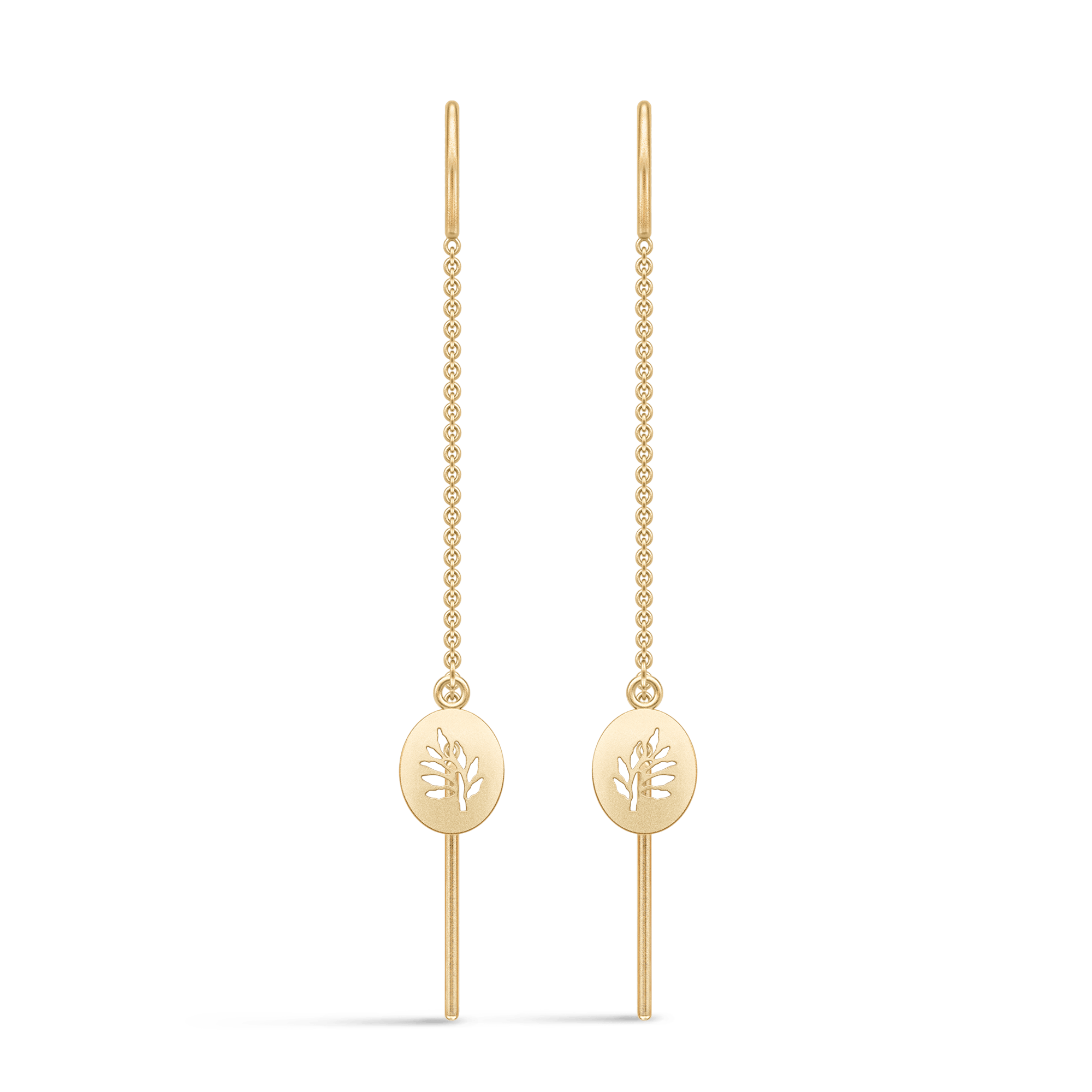 Elegante kædeøreringe fra den ikoniske Tree of Life kollektion. Øreringene er udformet i 22 karat forgyldt 925 sterling sølv med et lille ovalt vedhæng foran og kæde bagpå. Sælges som par og måler 53 x 6 mm. For hvert solgte smykke i Tree of Life kollektionen, planter vi et træ i Nord Vietnam nær vores fabrik.